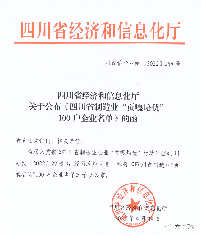 日前,四川省經(jīng)濟(jì)和信息化廳公布了《關(guān)于四川省制造業(yè)“貢嘎培優(yōu)”100戶企業(yè)名單》,四川六合特種金屬材料股份有限公司(以下簡(jiǎn)稱:六合特材)榜上有名。
