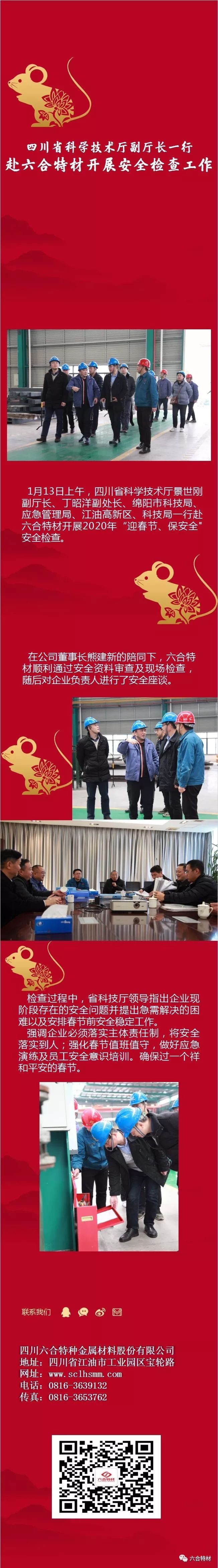 1月13日上午,四川省科學(xué)技術(shù)廳景世剛副廳長、丁昭洋副處長、綿陽市科技局、應(yīng)急管理局、江油高新區(qū)、科技局一行赴六合特材開展2020年“迎春節(jié)、保安全"安全檢查。