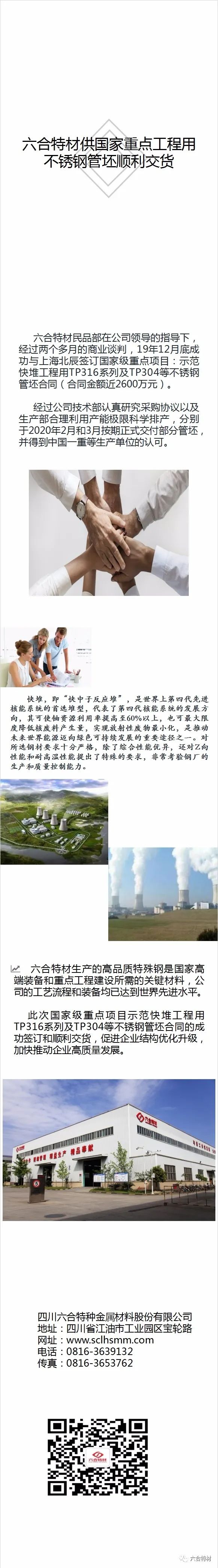 ? 六合特材民品部在公司領導的指導下,經過兩個多月的商業(yè)談判,19年12月底成功與上海北辰簽訂國家級重點項目:示范快堆工程用TP316系列及TP304等不銹鋼管坯合同,并于2020年2月和3月按期正式交付部分管坯。