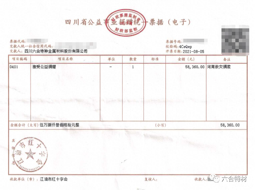 8月5日,六合特材積極貫徹落實(shí)習(xí)近平總書記對(duì)防汛救災(zāi)工作作出的重要指示精神,通過江油市紅十字會(huì)向河南災(zāi)區(qū)捐款合計(jì)58360元,支持河南水災(zāi)經(jīng)濟(jì)救援和災(zāi)后恢復(fù)重建工作。