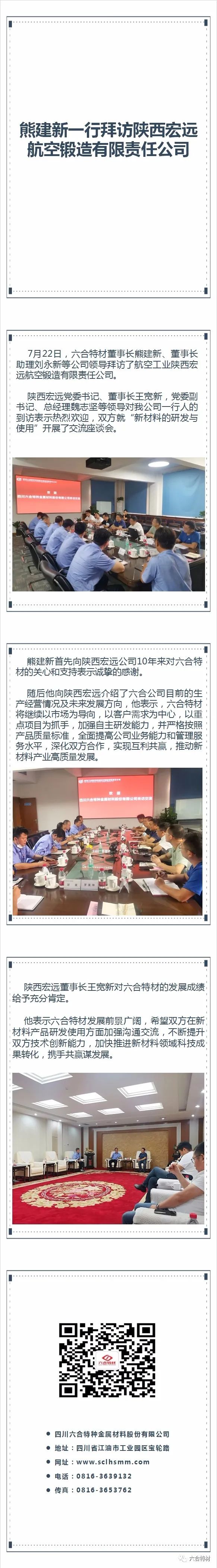 7月22日,六合特材董事長熊建新、董事長助理劉永新等公司領導拜訪了航空工業(yè)陜西宏遠航空鍛造有限責任公司。