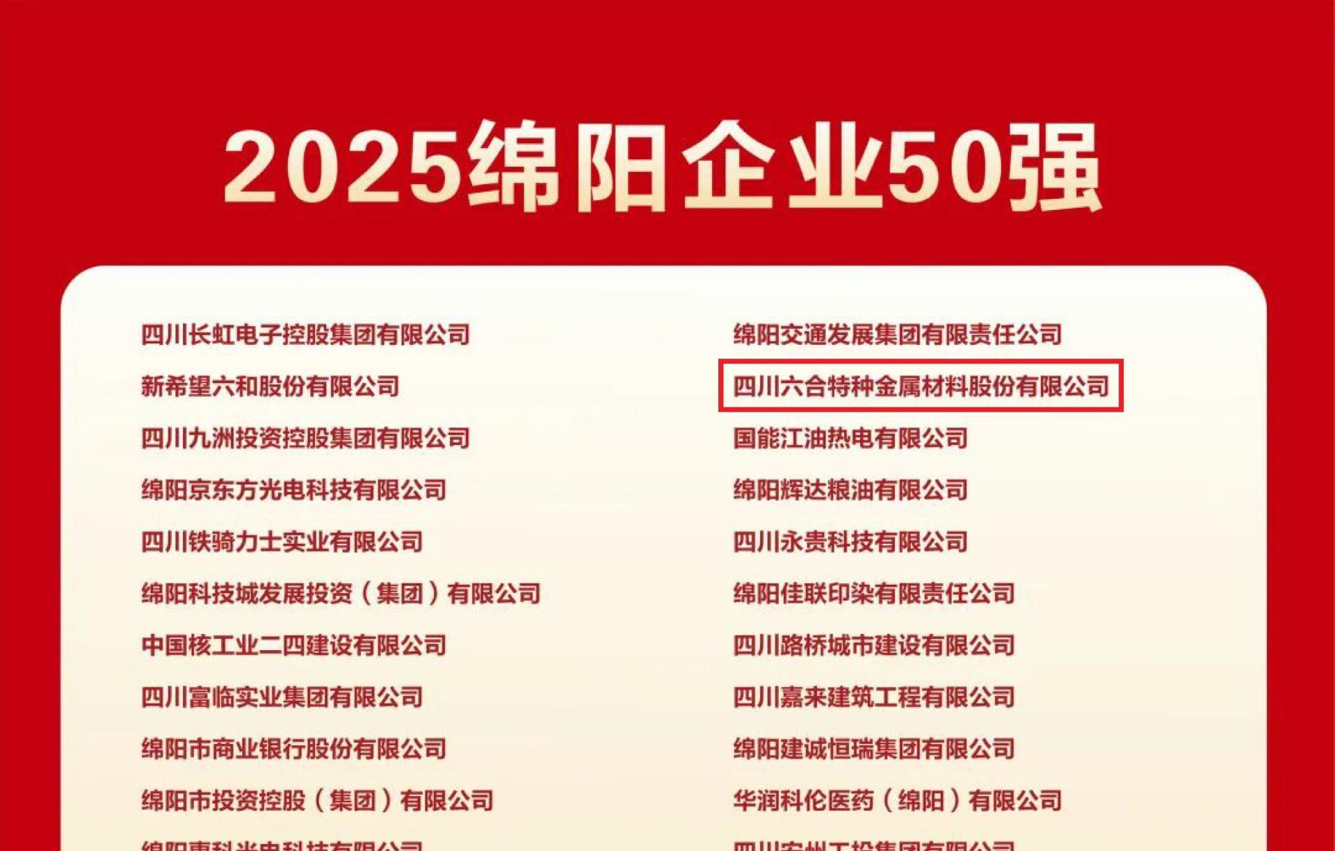 六合特材榮登 2025 綿陽企業(yè) 50 強榜單