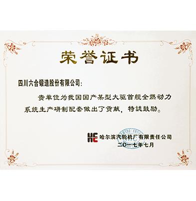 六合產(chǎn)品應(yīng)用于國產(chǎn)航母首艦榮譽證書