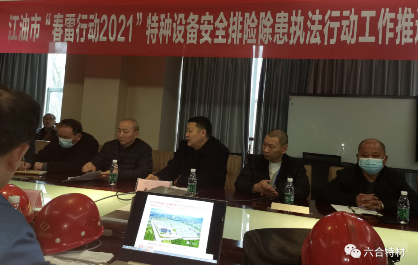 2021年3月20日,為有效提升江油市轄區(qū)重點(diǎn)單位、重點(diǎn)行業(yè)、重點(diǎn)場所的特種設(shè)備使用管理水平,加大特種設(shè)備隱患排查和整治力度,確保特種設(shè)備使用安全,江油市市場監(jiān)督管理局在六合特材公司組織召開了江油市2021特種設(shè)備(起重機(jī)械)安全排險(xiǎn)除患經(jīng)驗(yàn)交流現(xiàn)場會(huì)暨江油市“春雷行動(dòng)2021”特種設(shè)備安全排險(xiǎn)除患執(zhí)法行動(dòng)工作推進(jìn)會(huì)活動(dòng)。